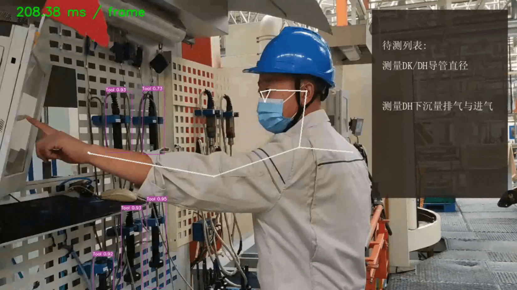 - 发动机缸体生产好以后需要对多项指标进行人工检测,员工检测过程中可能存在不按工艺顺序检测/选错工具等情况,而现场没有有效手段可以防止员工犯错或发现员工犯错的手段
